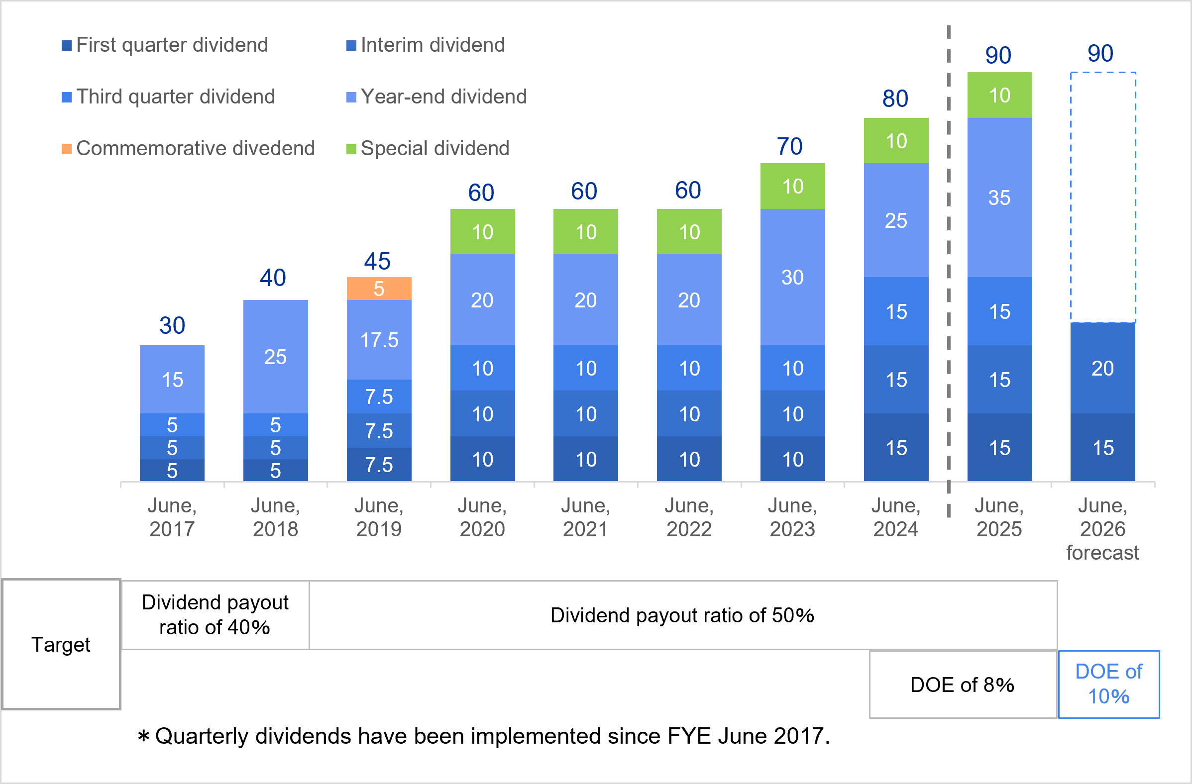 The Group recognizes that returning profits to its shareholders is an important management issue, and makes it a basic policy to pay continuous and stable dividends while taking into account the needs for internal reserves for the strengthening of management base and future business development. Under this policy, in order to achieve stable shareholder returns that are not affected by short-term business performance fluctuations, we have set a target for a consolidated DOE of approximately 10%.